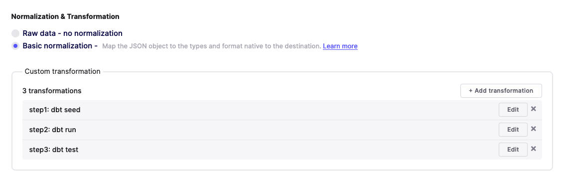 Normalization and Custom Transformation are deprecated features. Destinations using Normalization will be replaced by Typing and Deduping. Custom Transformation will be removed on March 31. For more information, visit here.